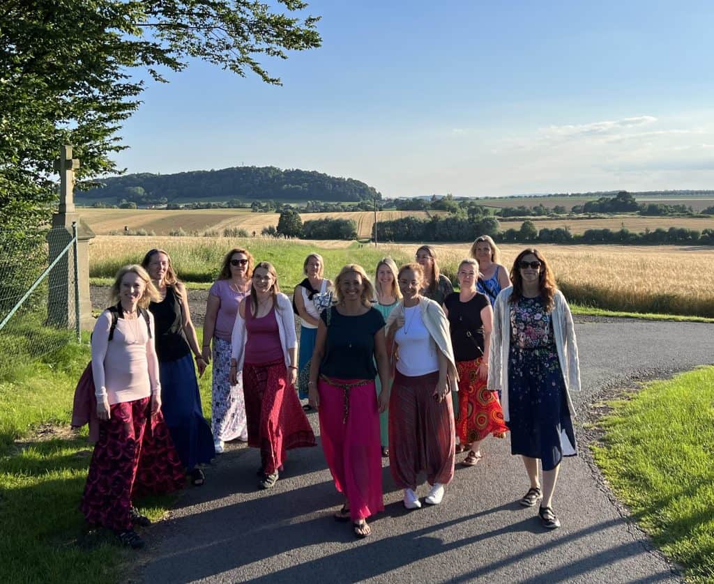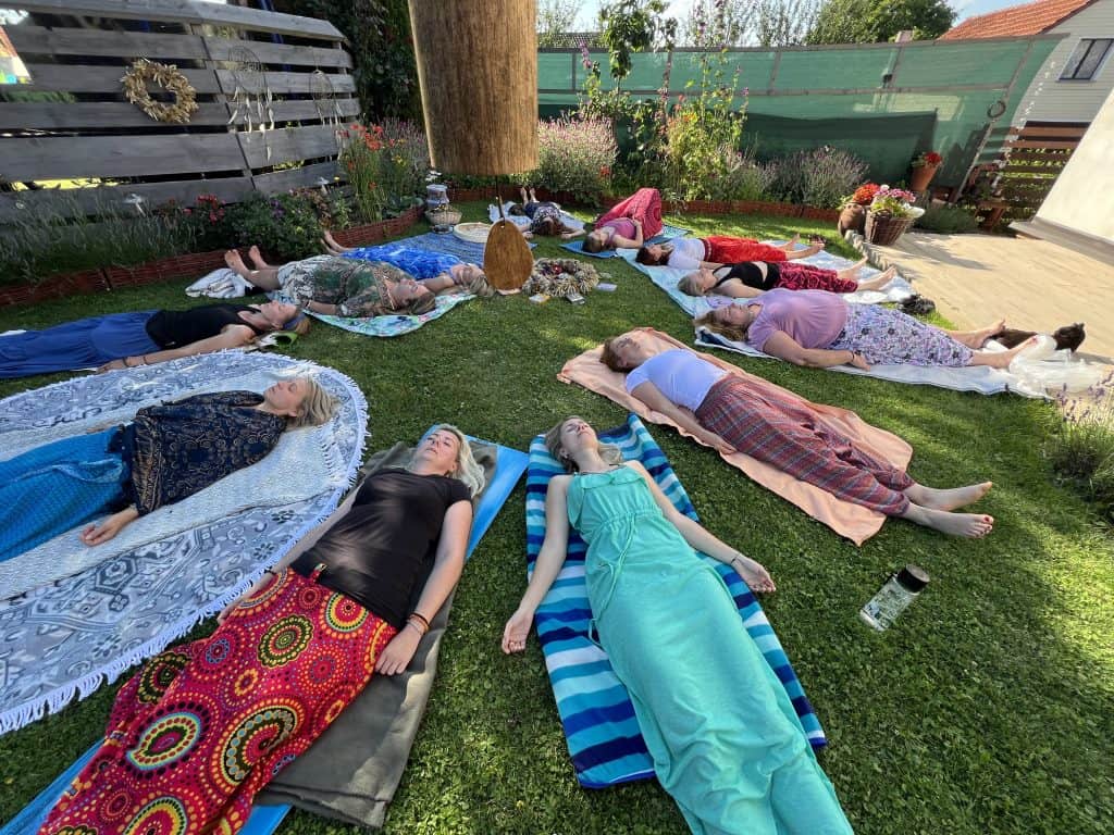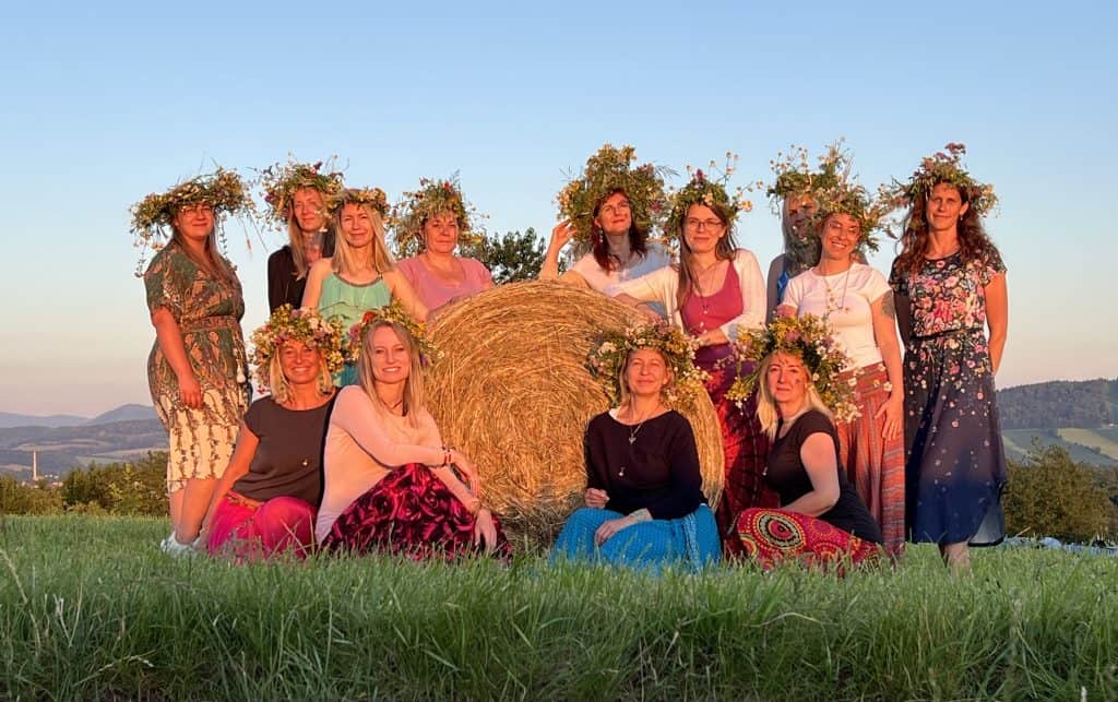 Pak následuje samotná rituál – očista těla, energie, osvobození od rodinných zátěží, uvedení dívky do tématu, odloučení od vazby matka – holčička. Pletení věnečku, výroba náramku z minerálů.